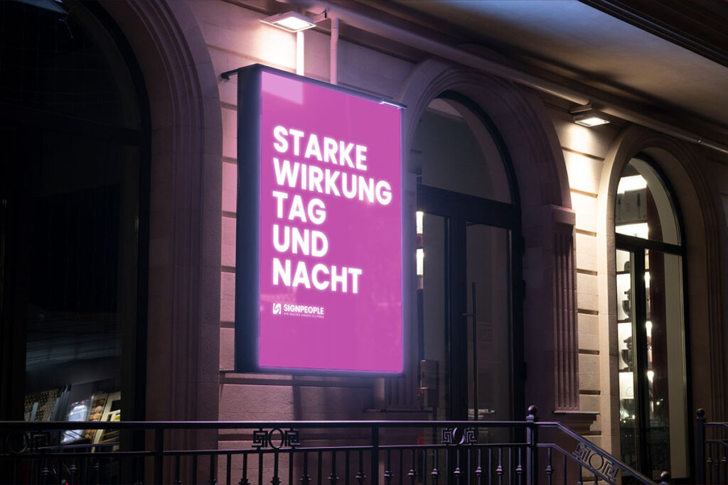 Leuchtkästen bieten eine effektive Möglichkeit, Ihre Werbebotschaft auch bei Dunkelheit klar und aufmerksamkeitsstark zu präsentieren. Die gleichmäßige Ausleuchtung sorgt für leuchtende Farben, gute Lesbarkeit und eine überzeugende Außenwirkung – 24/7 sichtbar.